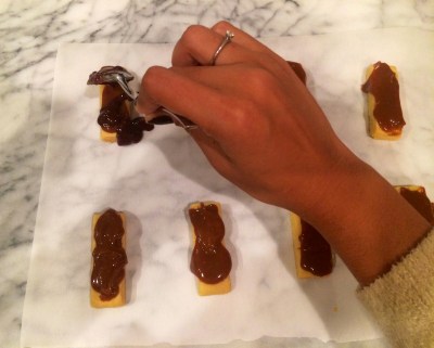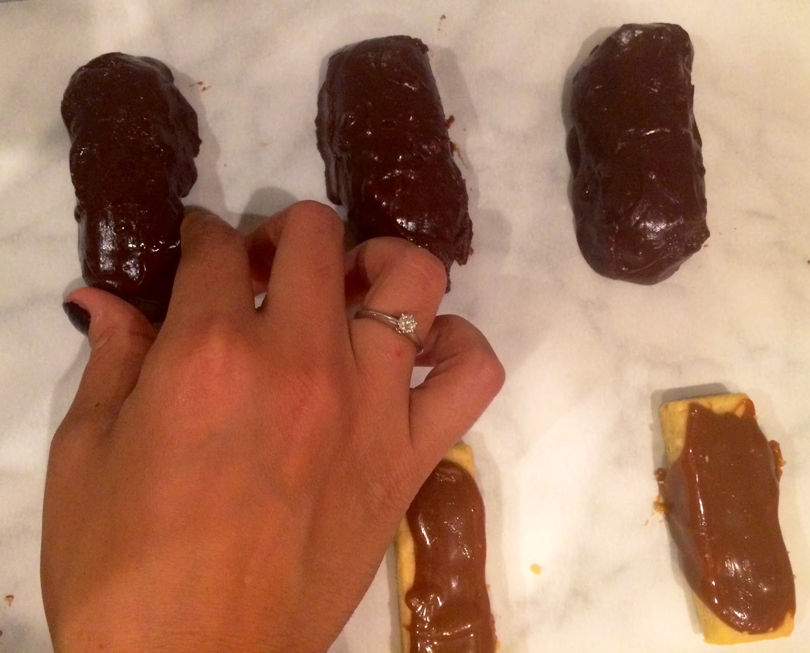 3. Then drizzle the milk chocolate over the caramel and cookie, allowing it to drip over the sides. After a couple minutes, help mold the shape of the chocolate with your fingers to give it more of a candy bar look and feel.