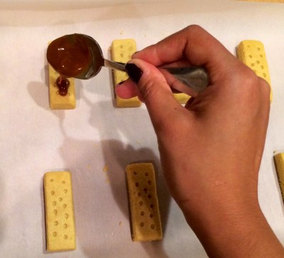 2. Once the caramel is melted and thickened, drizzle it on top of the cookie, avoiding it dripping over the sides.