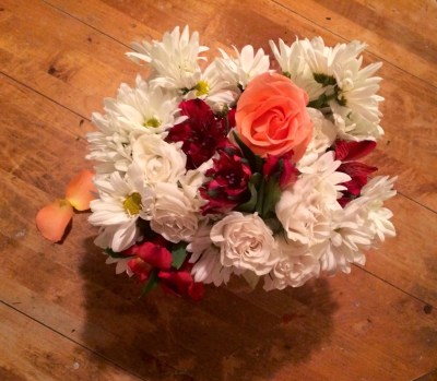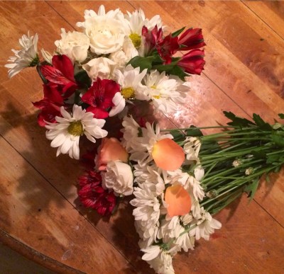 4. Take the medium sized flowers next. I choose to leave their stems just a little longer than the larger flowers, and place them in between the larger flowers.