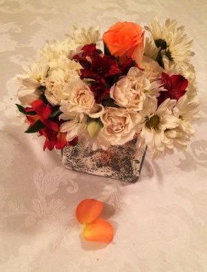 1. Choose from a frosted vase or clear vase. If you use a clear vase, line it with leaves to hide the oasis or water, and flower stems. I chose to use a mercury glass vase since I liked how it looked with the flowers.