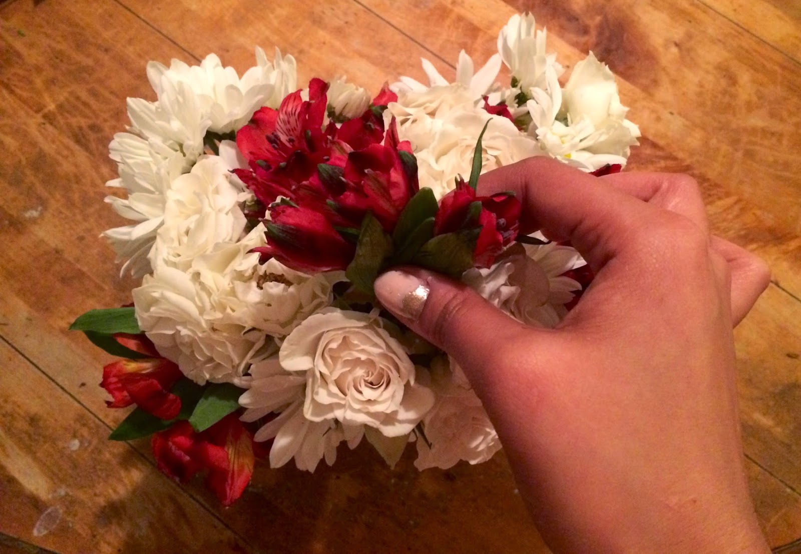 4. Take the medium sized flowers next. I choose to leave their stems just a little longer than the larger flowers, and place them in between the larger flowers.