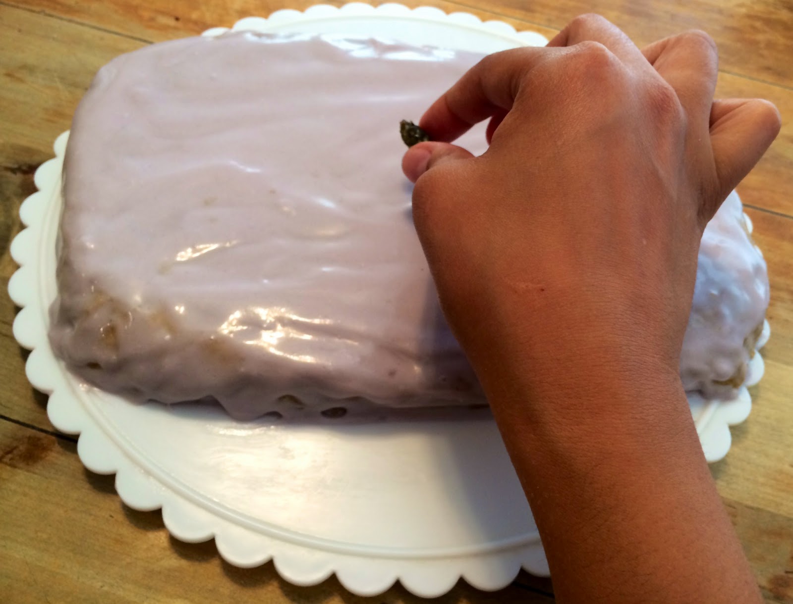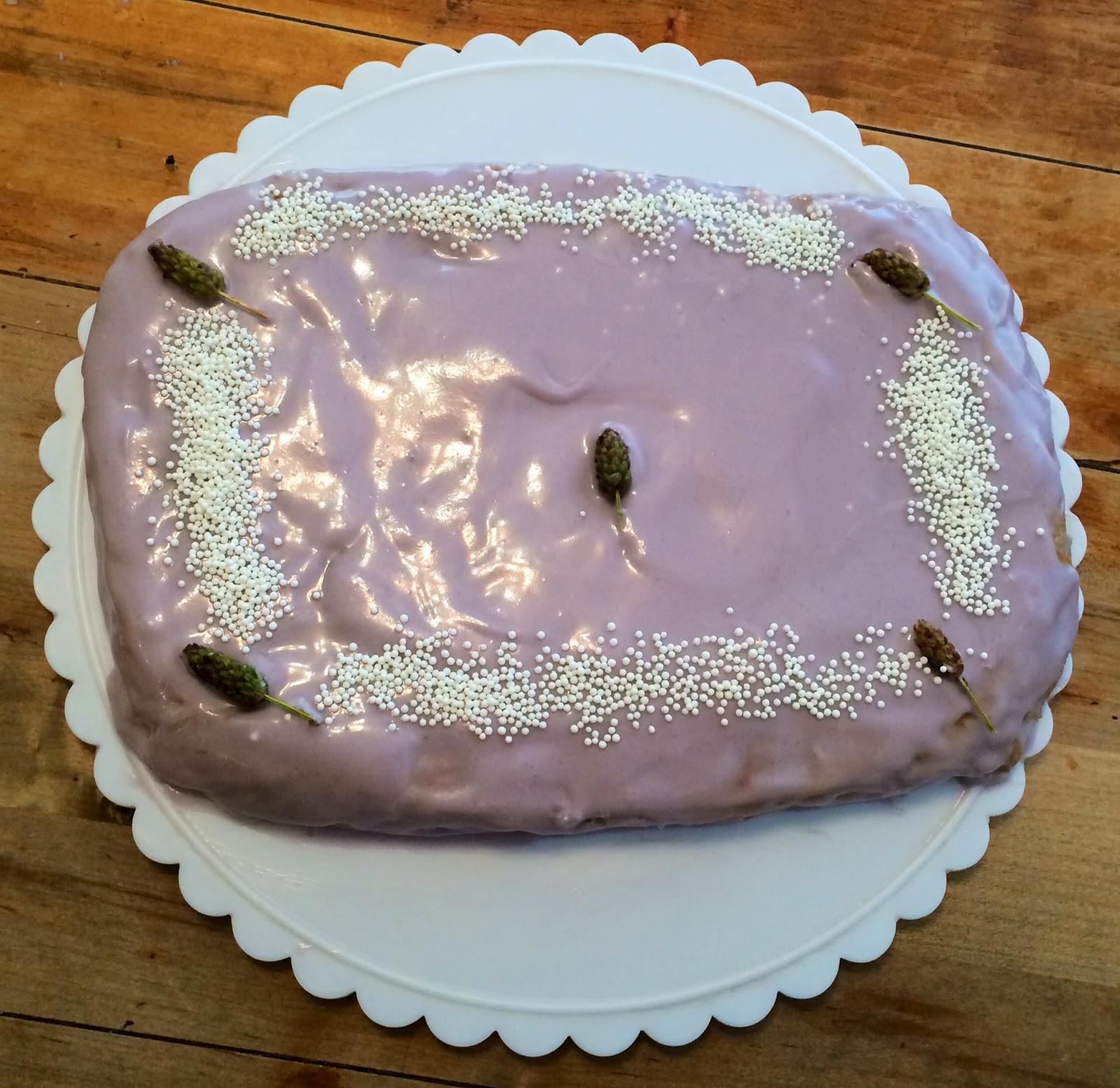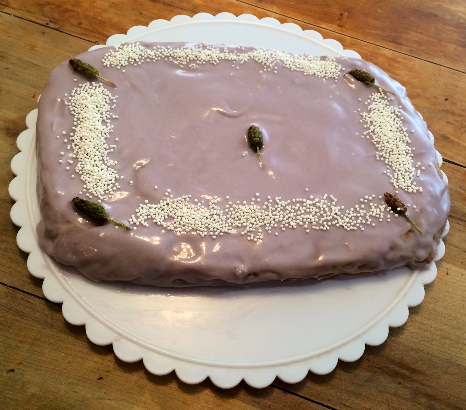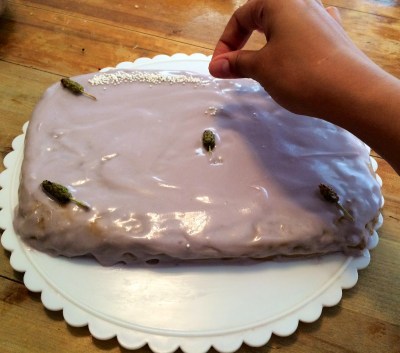 4. Once the cake has cooked and cooled, frost it. I added sugared lavender from the lavender simple syrup for a pretty garnish and sprinkled white nonpareils on the cake edges.