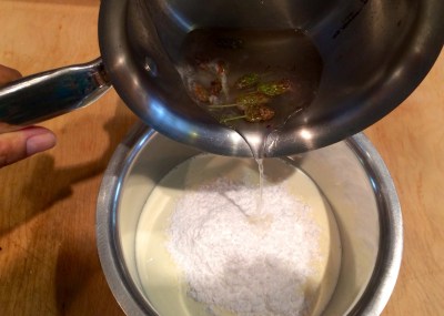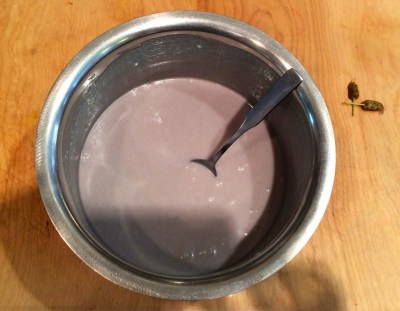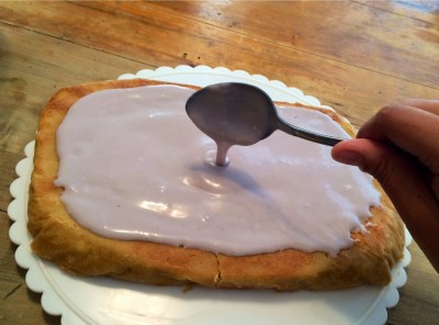 3. To make the frosting, use equal parts powdered sugar and heavy whipping cream, and one ounce lavender simple syrup, and blend. By adding in a little red and blue food coloring, it helps create the pretty lavender color. If the frosting looks a little blue/ grey, add in a touch of red, and if it looks a little pink, add in a touch of blue.