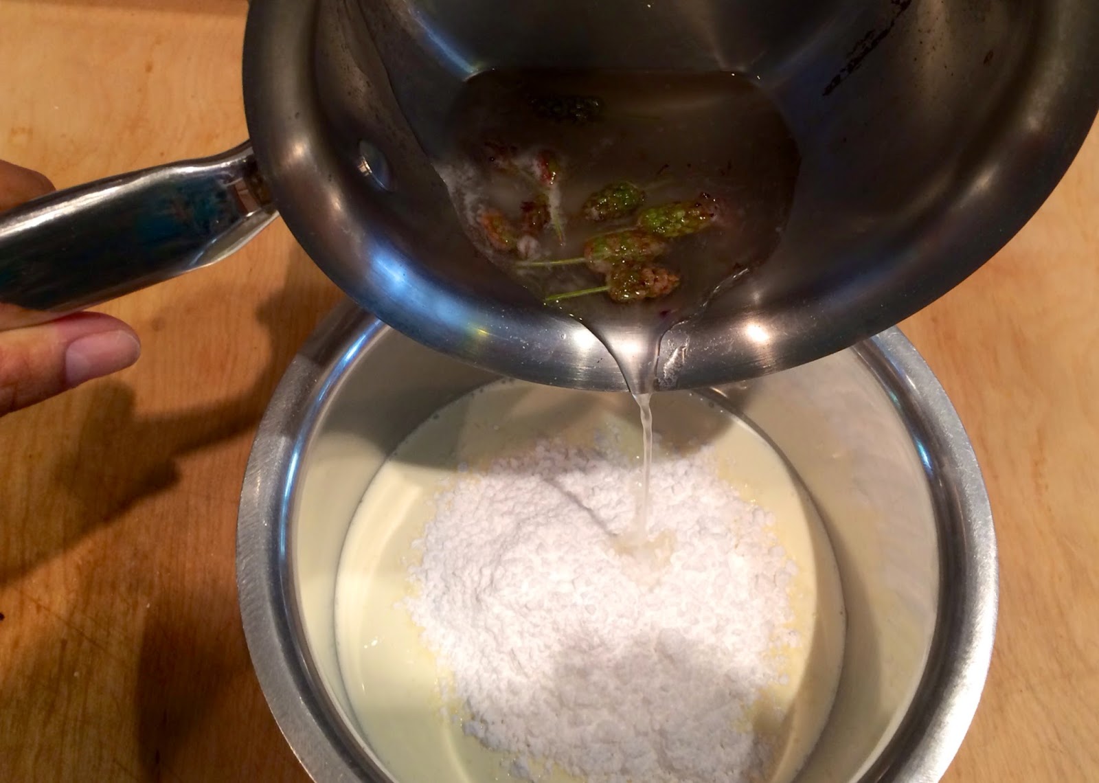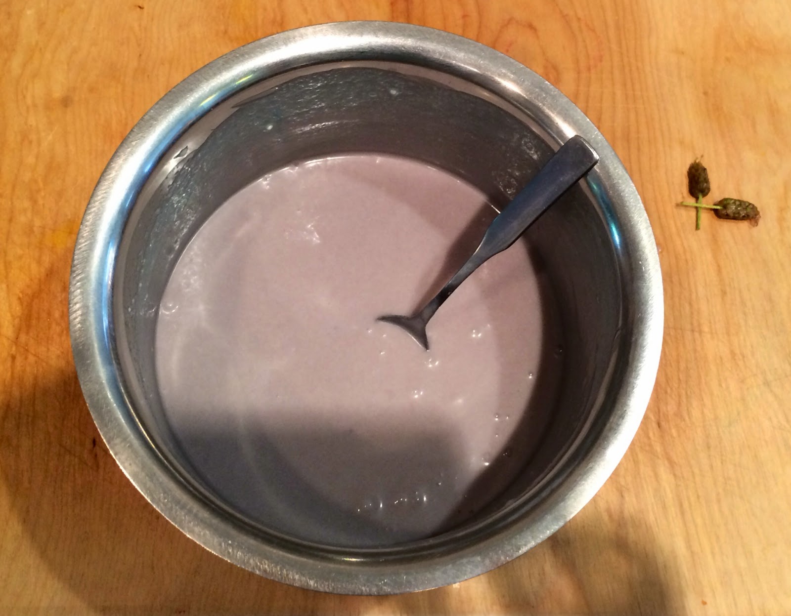 1. Mix a yellow cake mix and add in 1 ounce of lavender simple syrup {equal parts sugar and water with fresh lavender blossoms, boiled down} and earl grey tea with lavender notes. Note: You can substitute water for tea for a stronger flavor, or since I wanted a milder flavor I added in 1 ounce of earl grey tea to the cake mix.