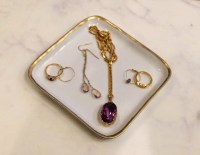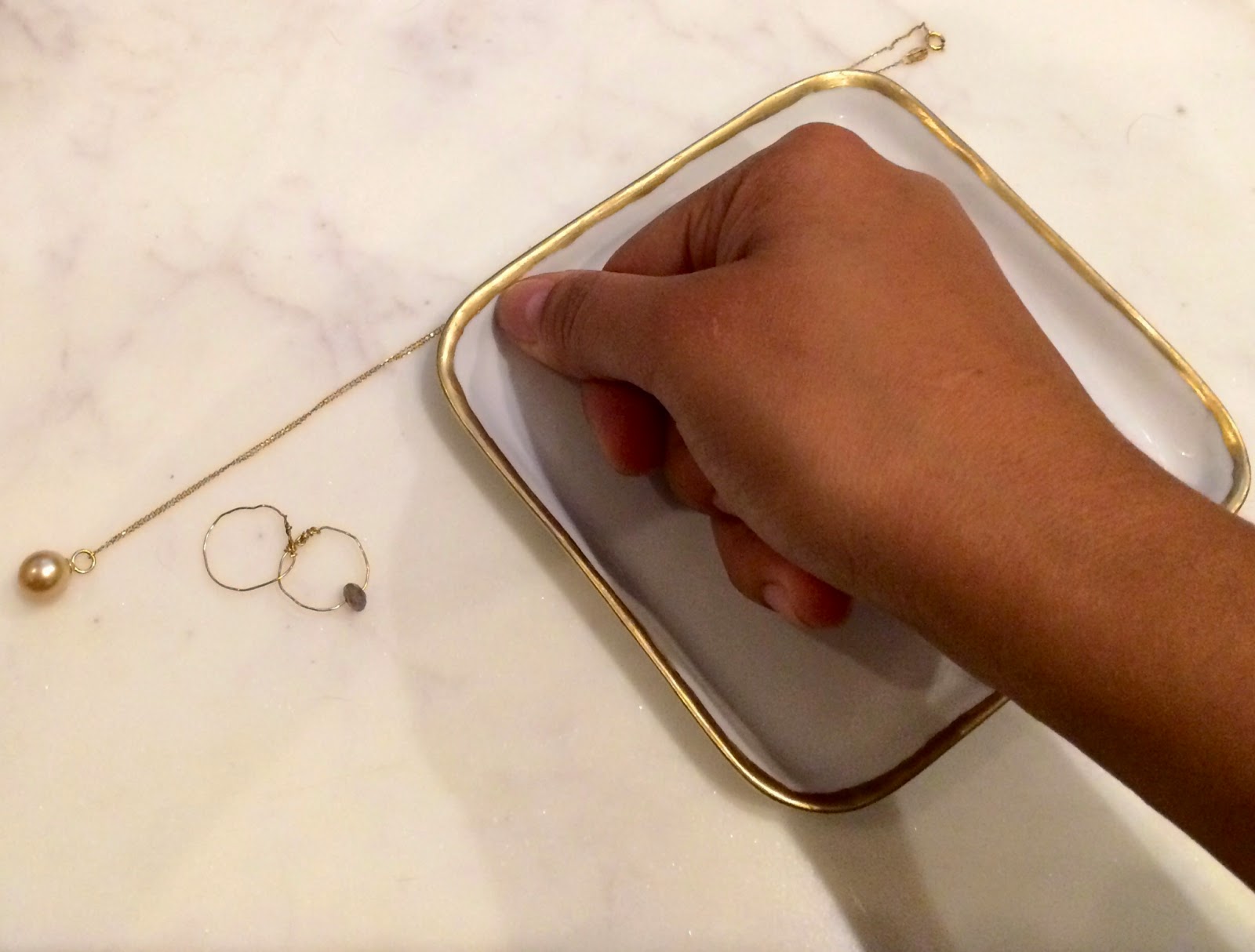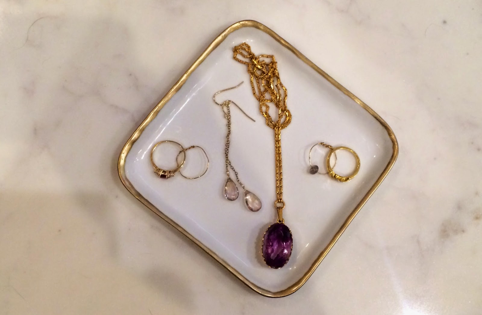 It’s pretty obvious to anyone who meets me that I am obsessed with gold. From gold jewelry {it took me a long time to warm up to silver, white gold, and platinum, though I adore them all now} to gold accent pieces around the house, there’s something about the warm, rich color that just adds a touch of pretty to any element. Since one of the things missing from my closet was a pretty jewelry dish, I knew I needed to create one and pay homage to my favorite interior design accent color. I decided to create a simple jewelry tray to help organize my things beautifully and corral my sparkliest jewels so that I can see their prettiness on a daily basis by DIY-ing a simple white appetizer plate. This tray helped organize my jewelry and leave my prettiest jewels on display, whether I placed it on my dresser, vanity, or nightstand. I loved that this simple DIY created a pretty punch of color {especially when juxtaposed to the basic white porcelain} that I find so appealing, and the best part is it cost me less than $5.