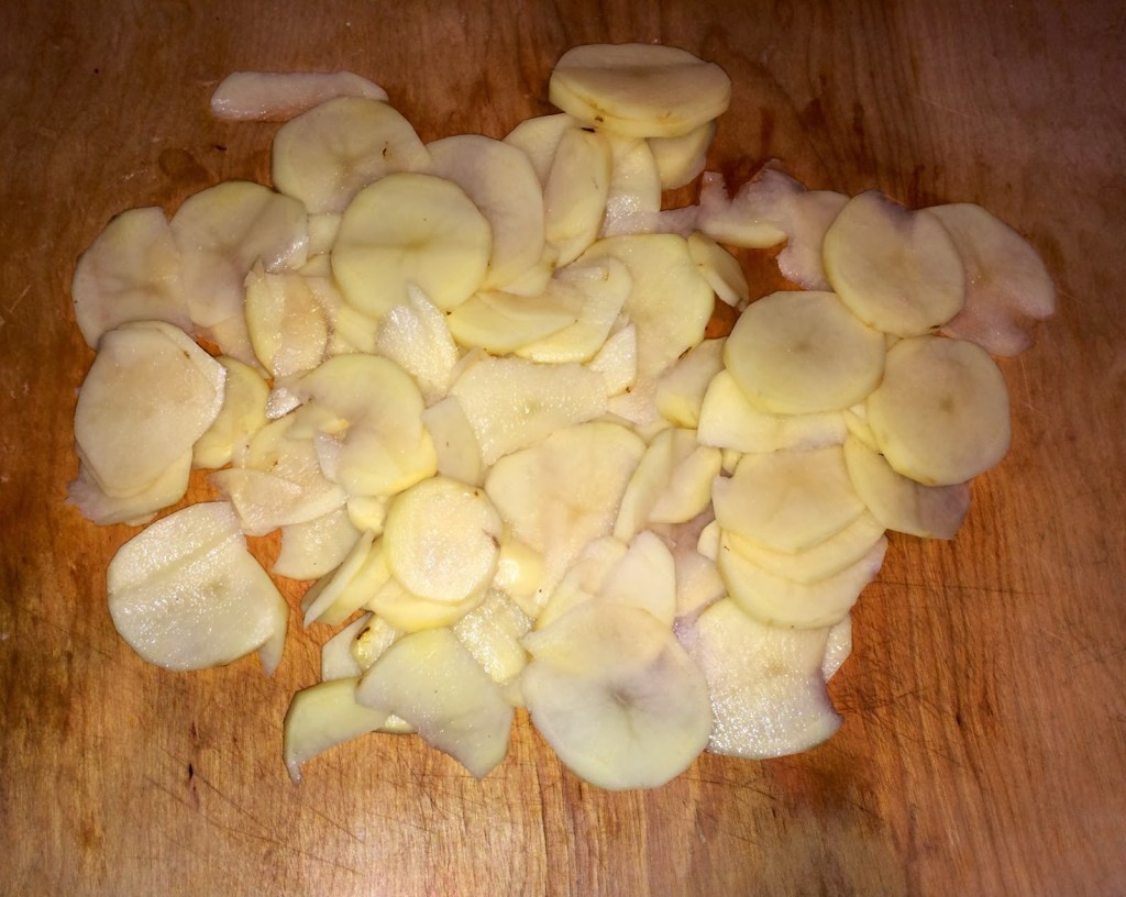 1. Slice the potatoes. Don’t be too concerned if they aren’t equal in thickness or size.