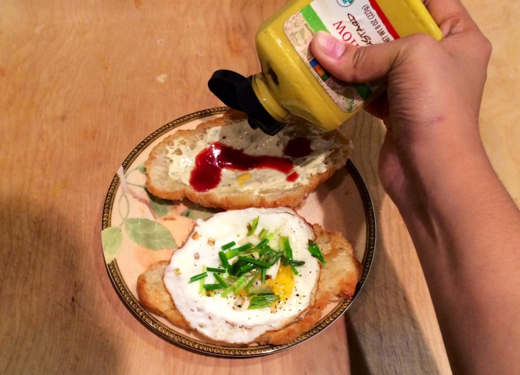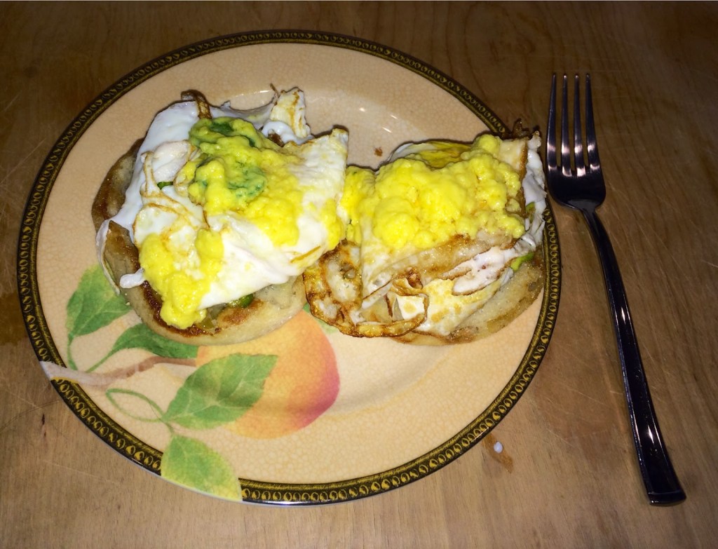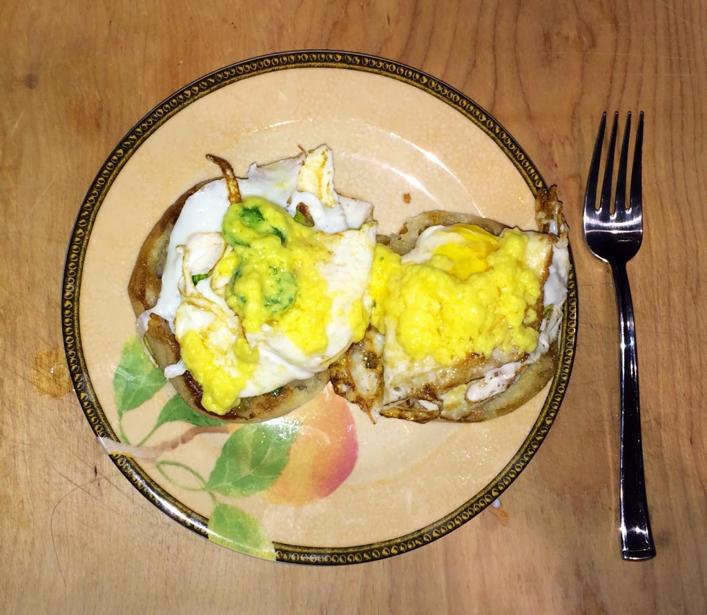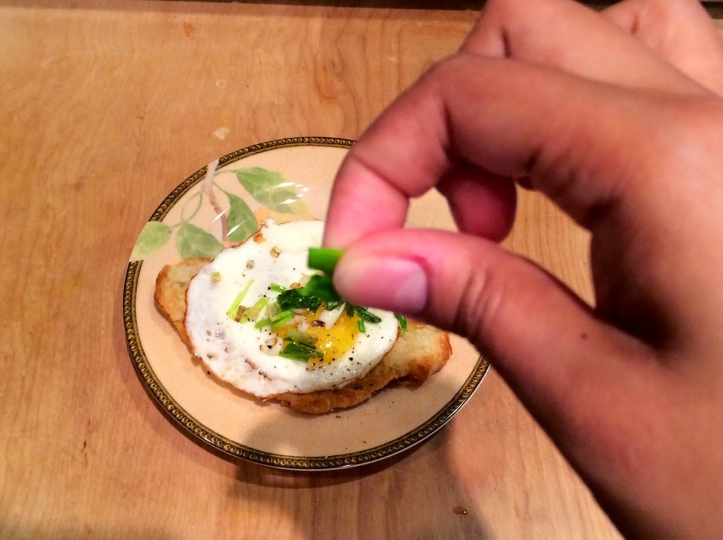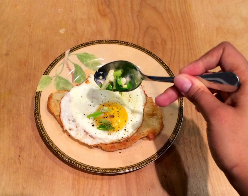 4. Since I destroyed two eggs that I tried to poach, I settled on making a fried egg, and wrapped the egg white over the yolk. This left it feeling like a poached egg and still allowing my eggs to get runny as I ate the dish.