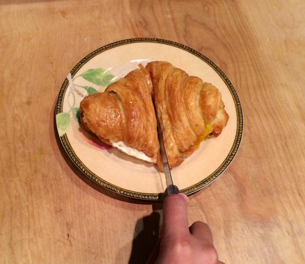 5. Place the top half of the croissant {which is covered in the condiments} on top of the bottom half of the croissant with the fried egg. Slice the sandwich in half, allowing the broken yolk to run.