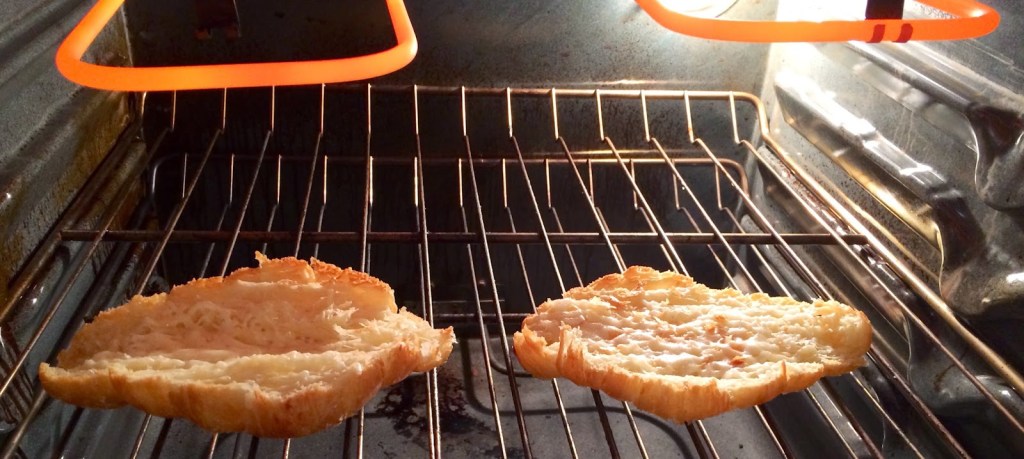 1. Slice the croissant in half, sprinkle it with the cheese, and broil on high for 4-5 minutes, or until golden brown.