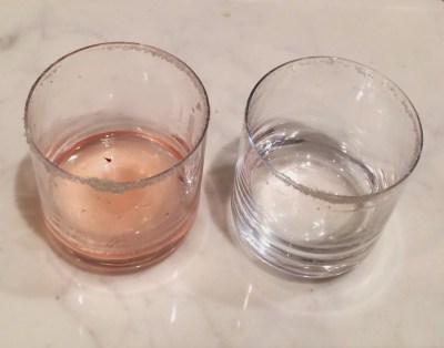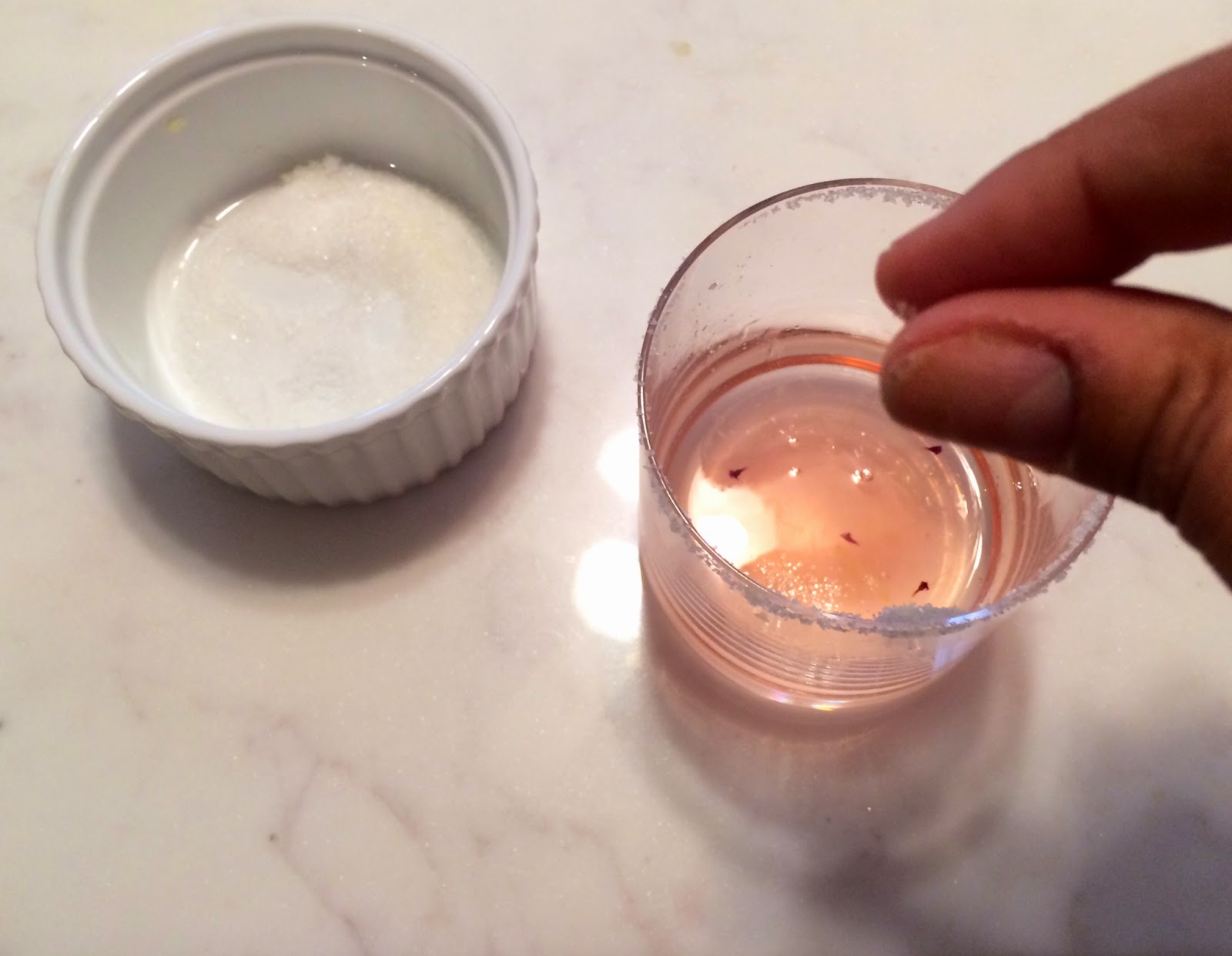 4. Rub half a lemon against the rim of the glass, and then turn the glass upside down into a bowl of salt to rim the edge. Note: sugar works equally well in this case.