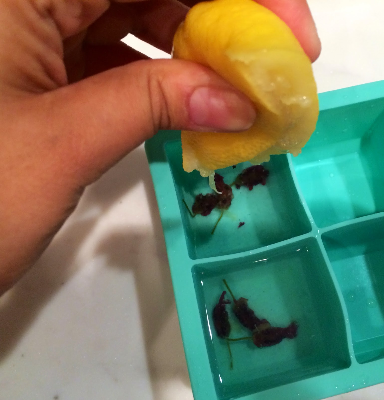 3. Separate the boiled lavender blossoms and toss them into the ice cube tray along with a splash of lemon juice to enhance the flavor of the ice as it melts.