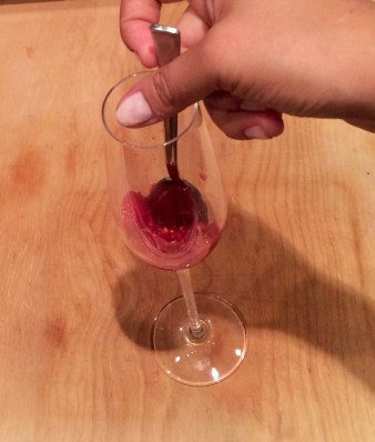 1. Muddle two to three strawberries in the champagne flute {a spoon works well in this situation}.