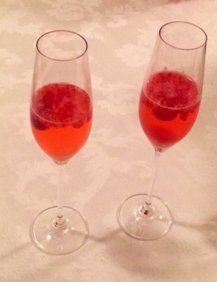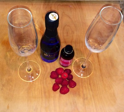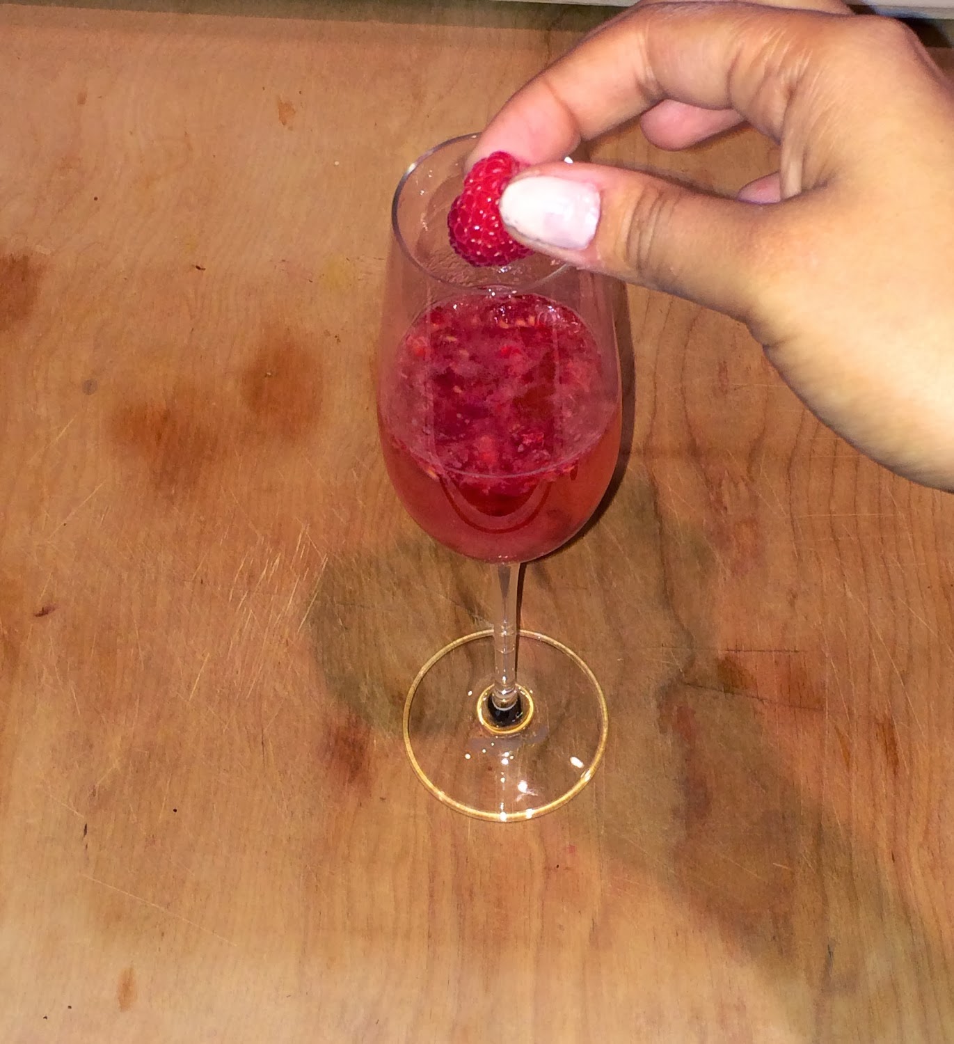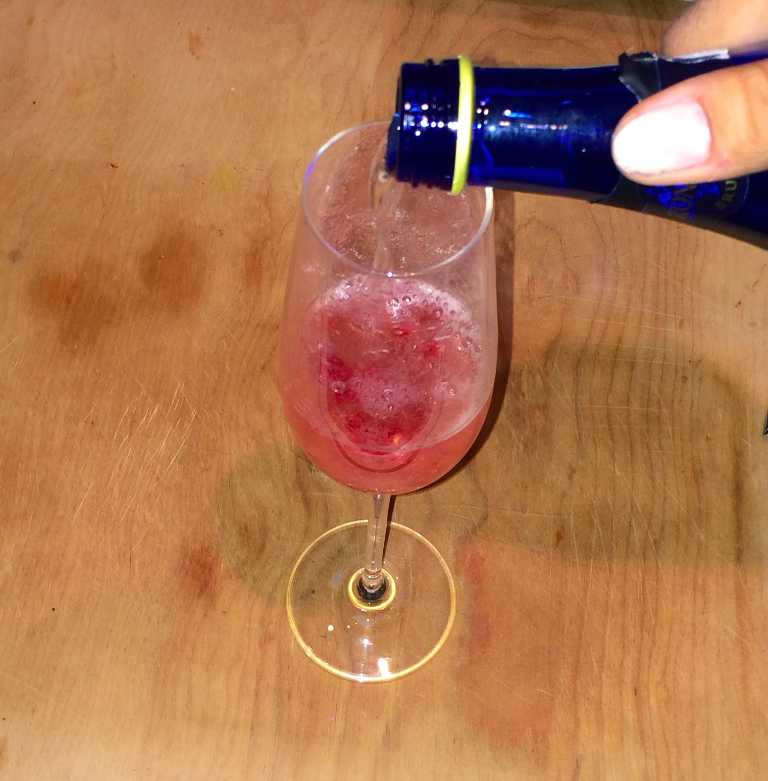 4. Fill the champagne flute completely, and add a raspberry as a finishing garnish.