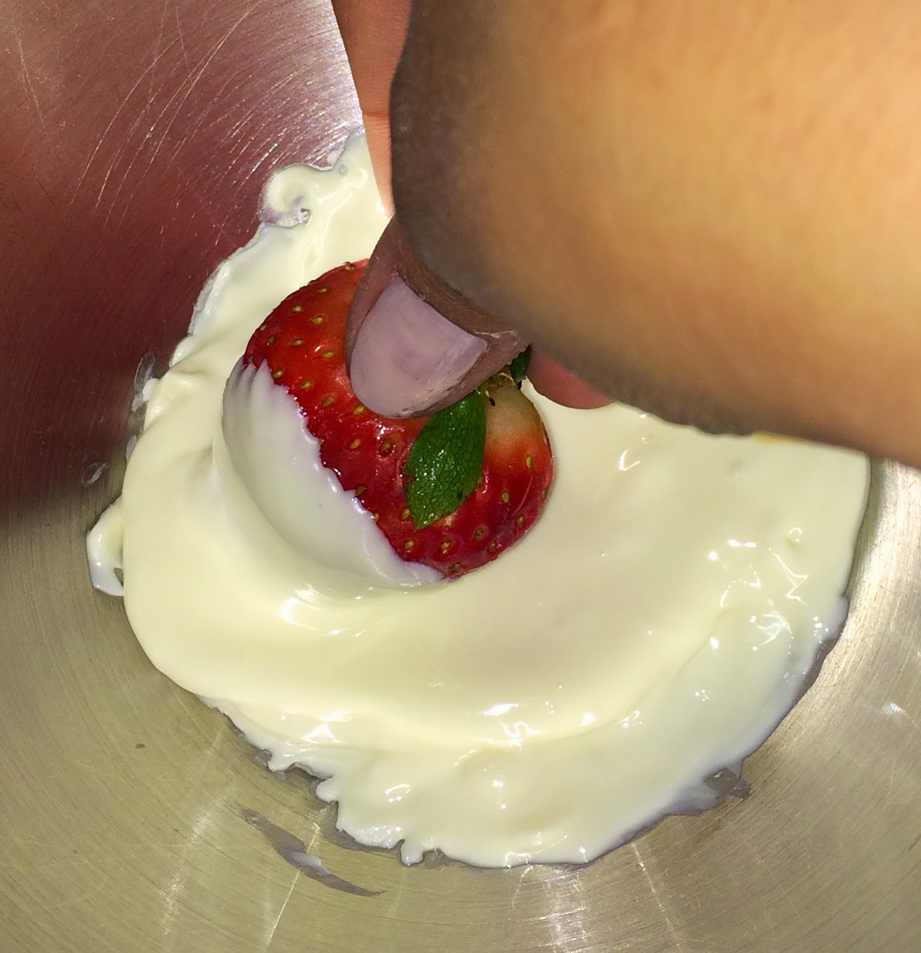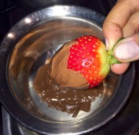 To make the chocolate covered strawberries, use a double boiler to melt the chocolate. Then dip the freshly washed strawberries in the melted chocolate. Immediately dip the chocolate covered strawberry into the topping of choice, and then refrigerate until the chocolate hardens.