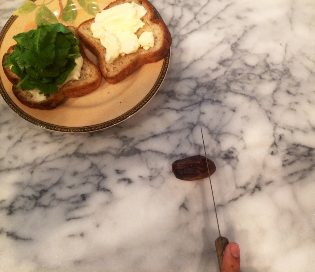 2. Spread the creamy part of the brie cheese, avoiding the rind, on both slices of bread. Next, add spinach to one slice of bread, and the chopped dates to the second slice.