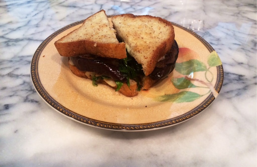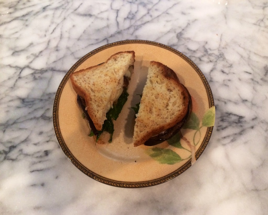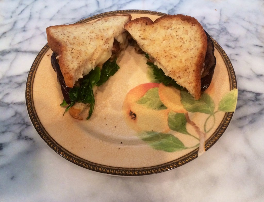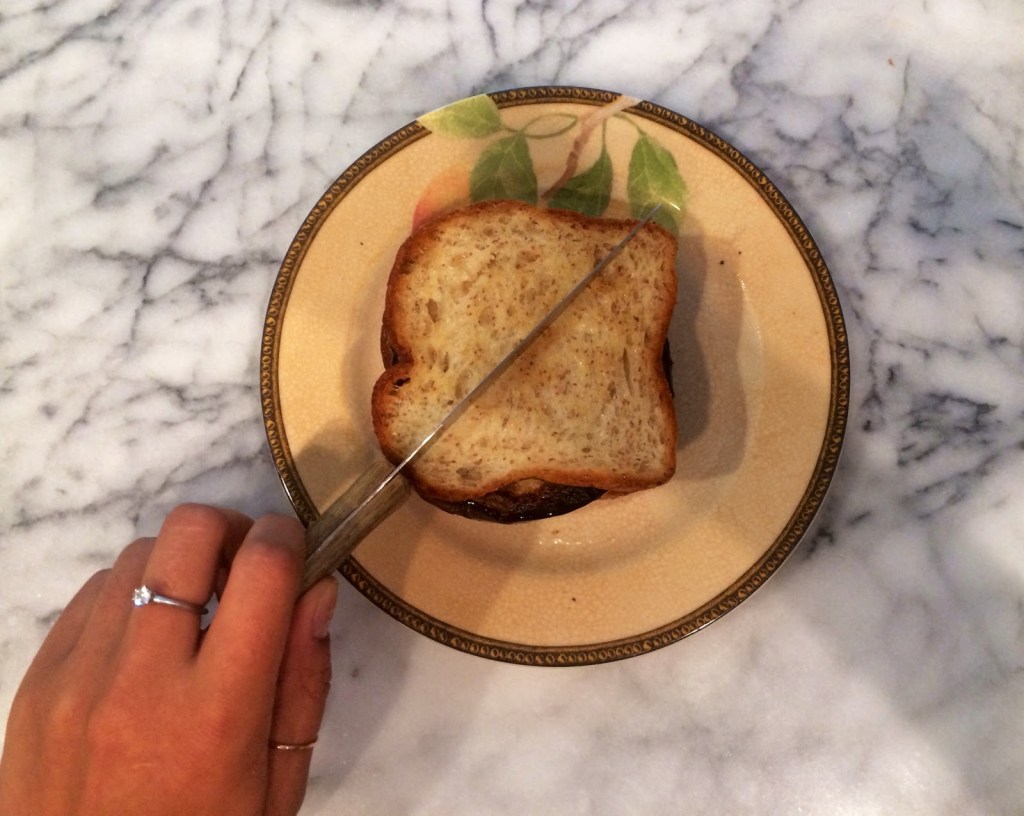 4. Add the grilled eggplant to the spinach topped bread. Then, add the other slice of bread on top and slice in half, letting the brie melt due to the warmth of the grilled eggplant.