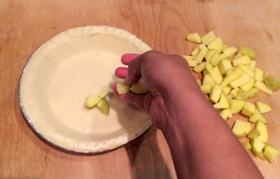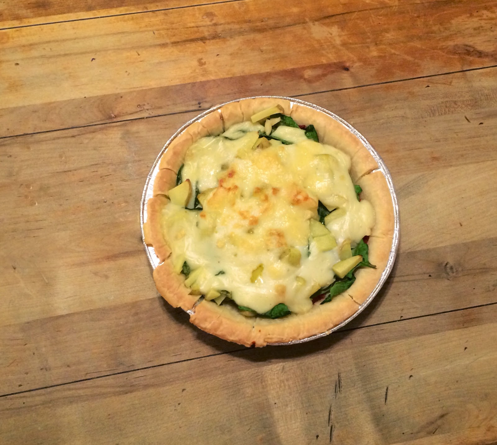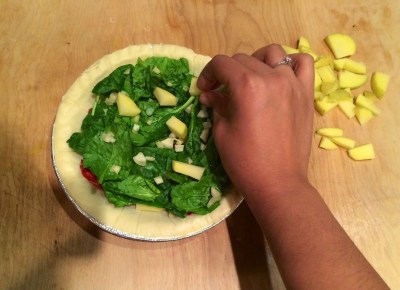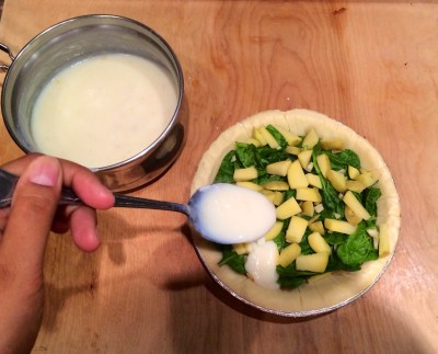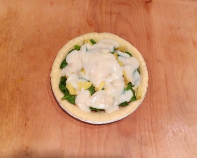 1. Chop up the potatoes and layer the base of your pie crust with it. Tip: To make the potatoes softer, you can half boil them first.