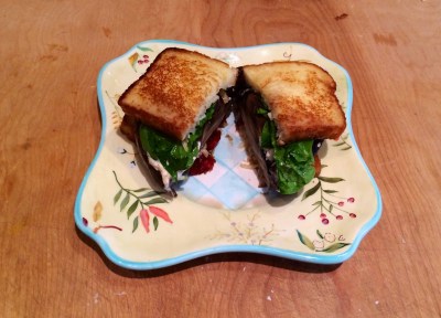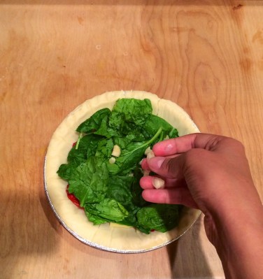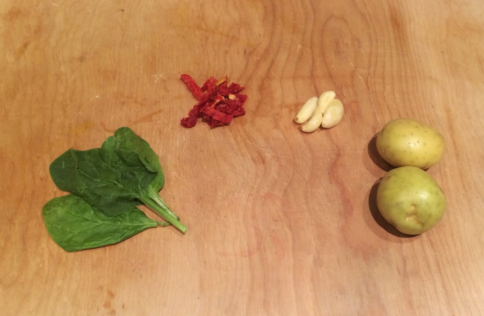 2. On top of the potatoes, add in sun dried tomatoes, followed by spinach, chopped garlic, and finally a top layer with more potato.