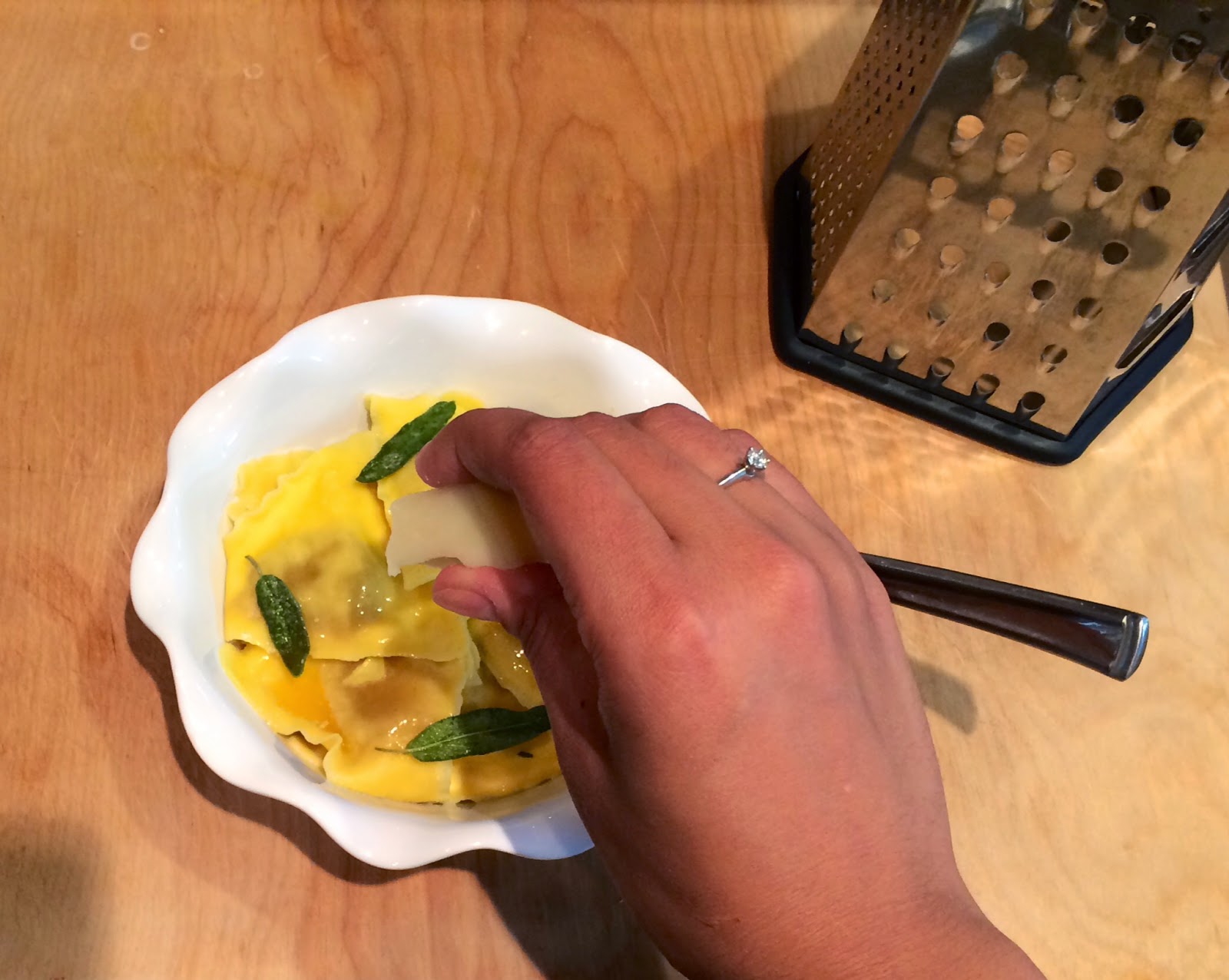 2. Once the butter has browned and the sage leaves have become crispy, pour it on top of the pasta.
