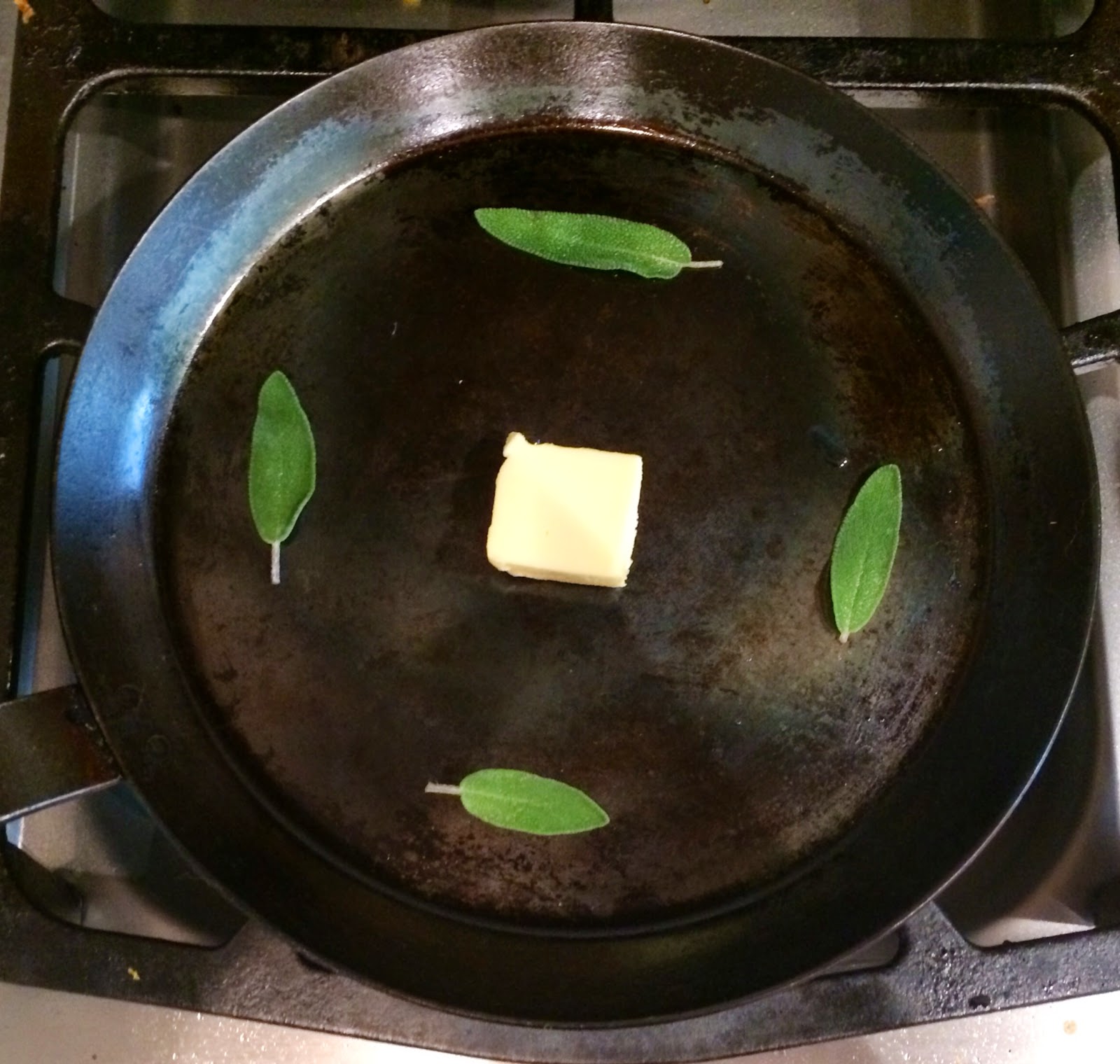 1. Boil the pasta. On a separate stove, heat some butter along with fresh sage leaves.