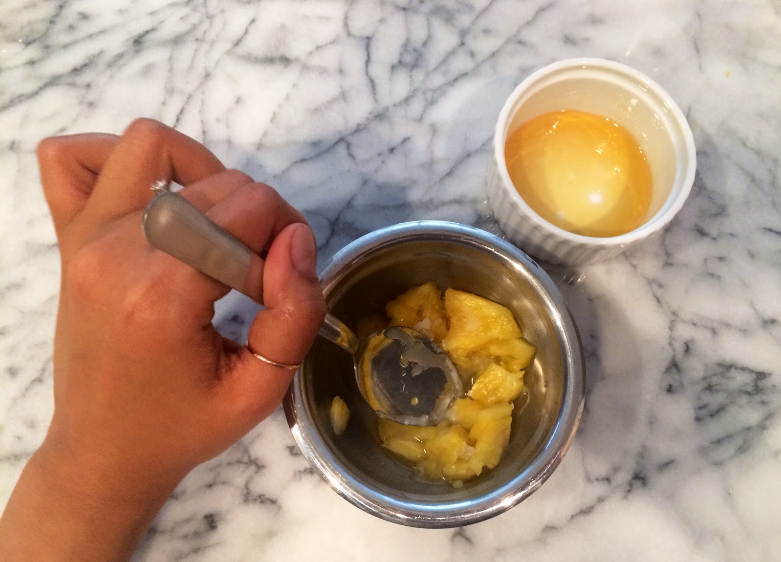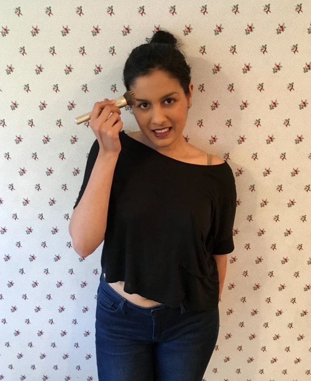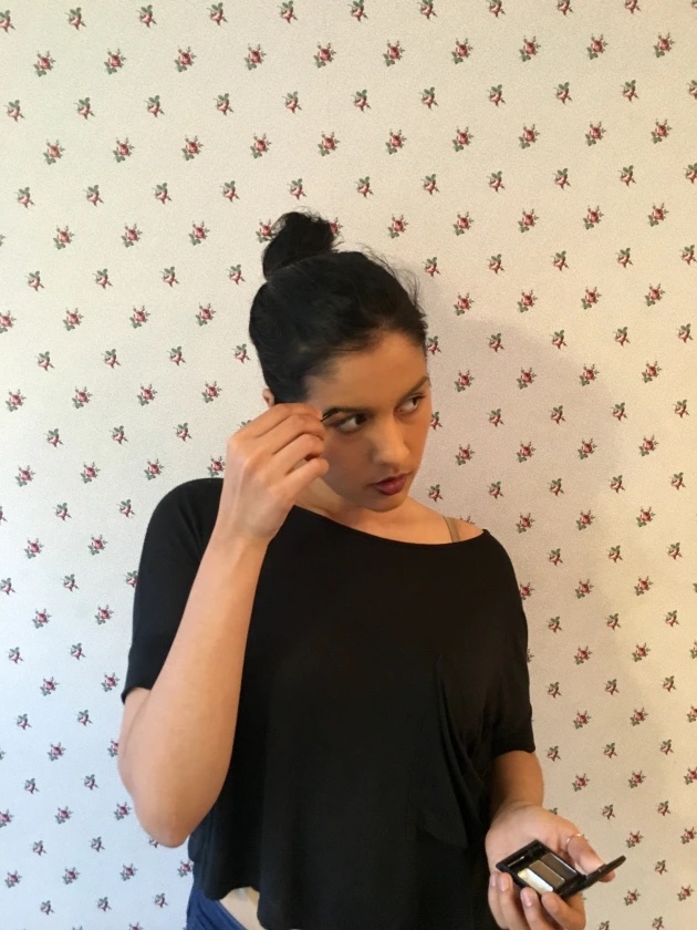 Step 1: Tweeze any stray brow hairs, then apply a thin layer of foundation all over your face, followed by a touch of blush.